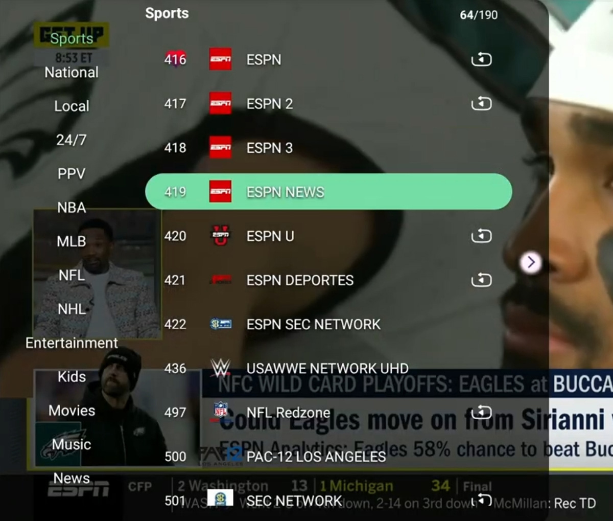MBL、NFL、フットボールリーグ(プレミアリーグ、ラ・リーガ、セリエA、リーグ・アン、ブンデスリーガ、中国スーパーリーグ、チャンピオンズリーグ、AFCチャンピオンズリーグ、ゴルフ、ワールドカップ、トーナメント、選手権などの主要な国際スポーツイベントのHDライブ放送を高解像度で視聴できます。