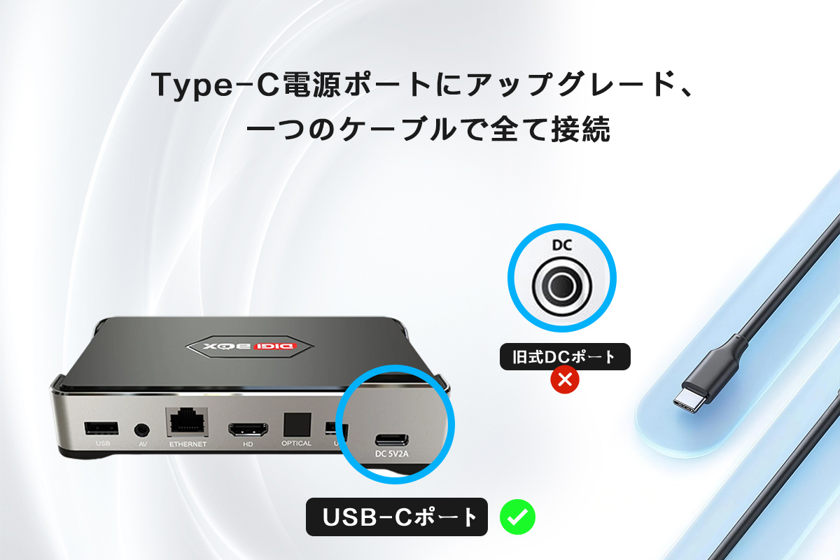 DIGIBox D6 Max Android TV ストリーミング ボックスはUSB-C 電源インターフェイスを備えており、簡単で柔軟かつ効率的な接続を提供し、旅行や家庭での使用に最適です。
