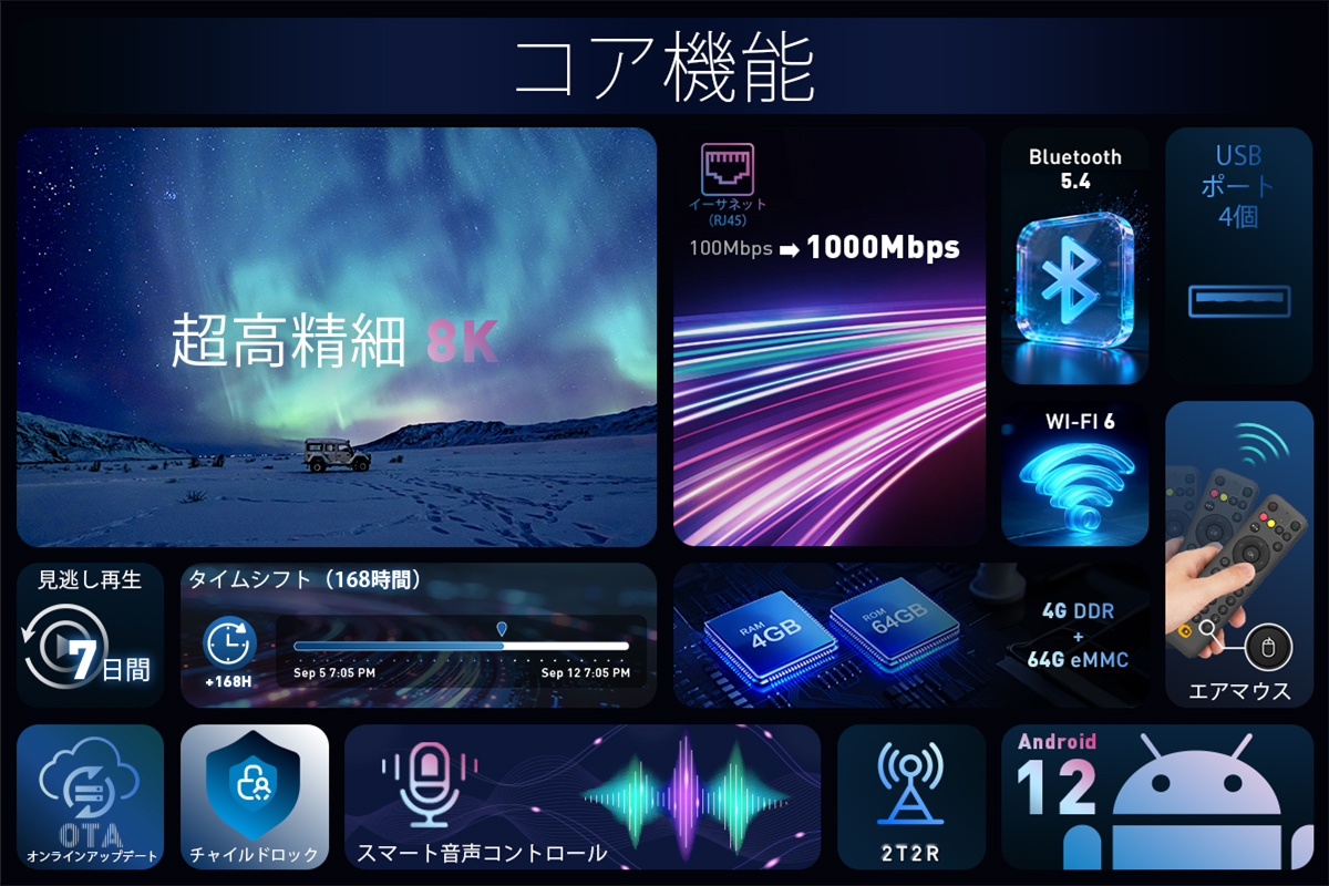 ▶️ ️DIGIBox D6 Maxは、 8K Ultra HDデコードによる鮮明な映像に加え、7日間の再生と168時間のタイムシフト再生に対応し、どんな瞬間も逃しません。4GB RAMと64GBストレージを搭載し、非常にスムーズなパフォーマンスを提供します。Wi -Fi 6 、ギガビットイーサネット、 Bluetooth 5.4により、より高速で安定した接続を実現します。Android 12を搭載し、音声コントロール、エアマウス、OTAアップデート、チャイルドロックなど、安全でスマートなエンターテイメント体験を提供します。