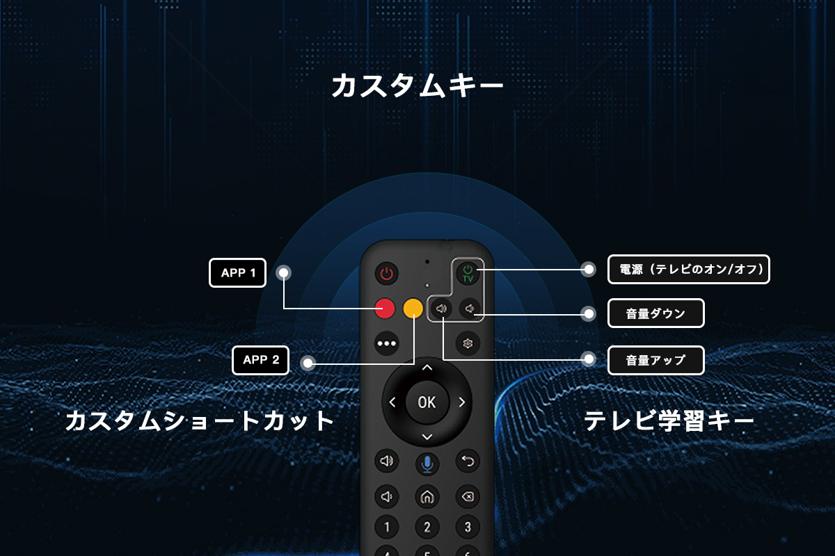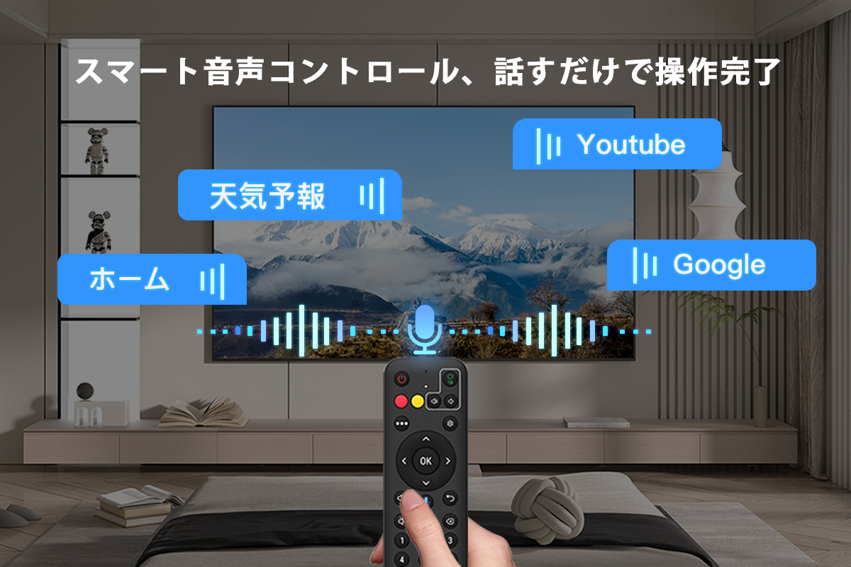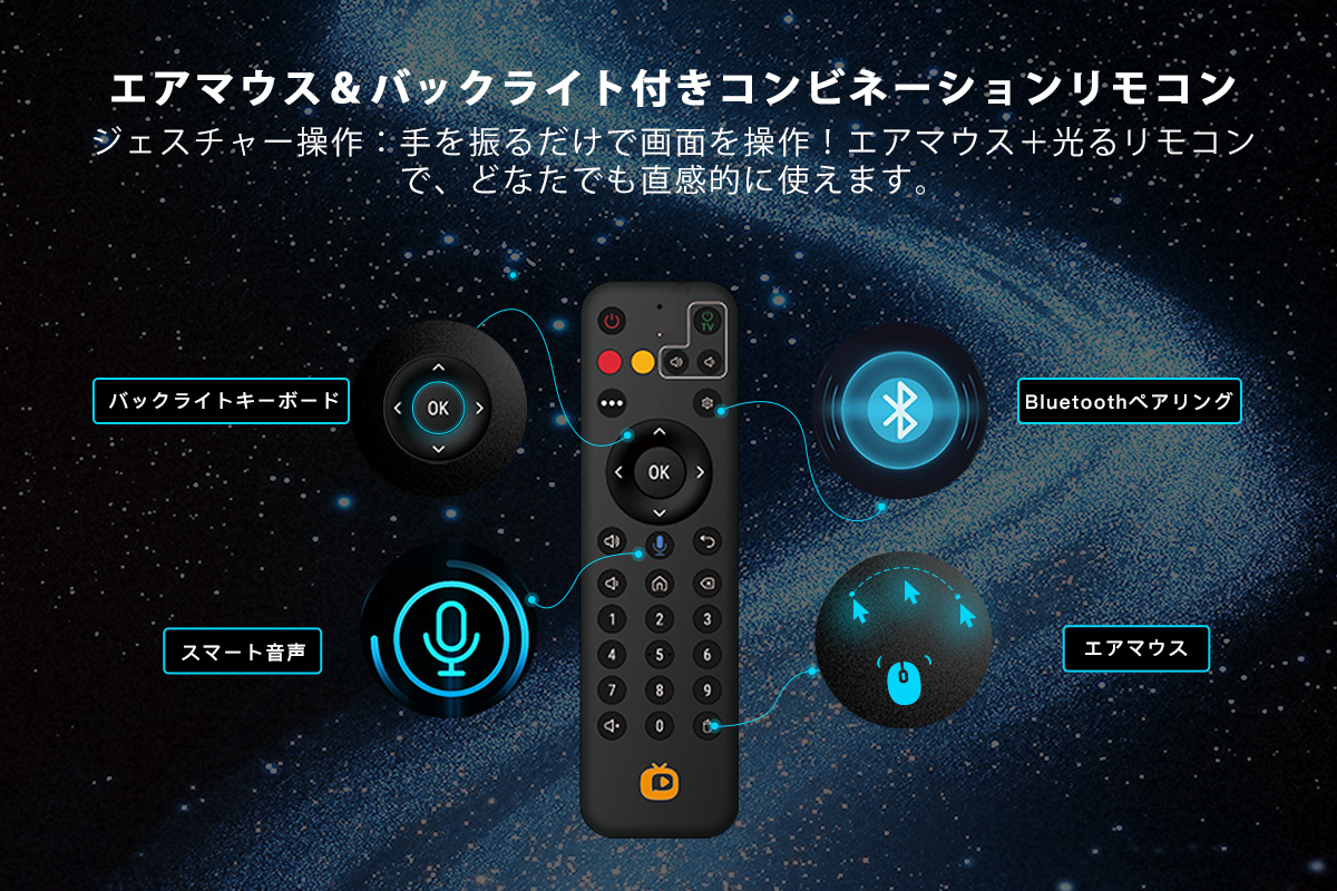 カスタマイズ可能なスマートリモコンを使用すると、お気に入りのアプリにすばやくアクセスするためのショートカットを作成でき、エアマウスとバックライト付きリモコンを使用すると、スムーズなナビゲーションが可能になります。