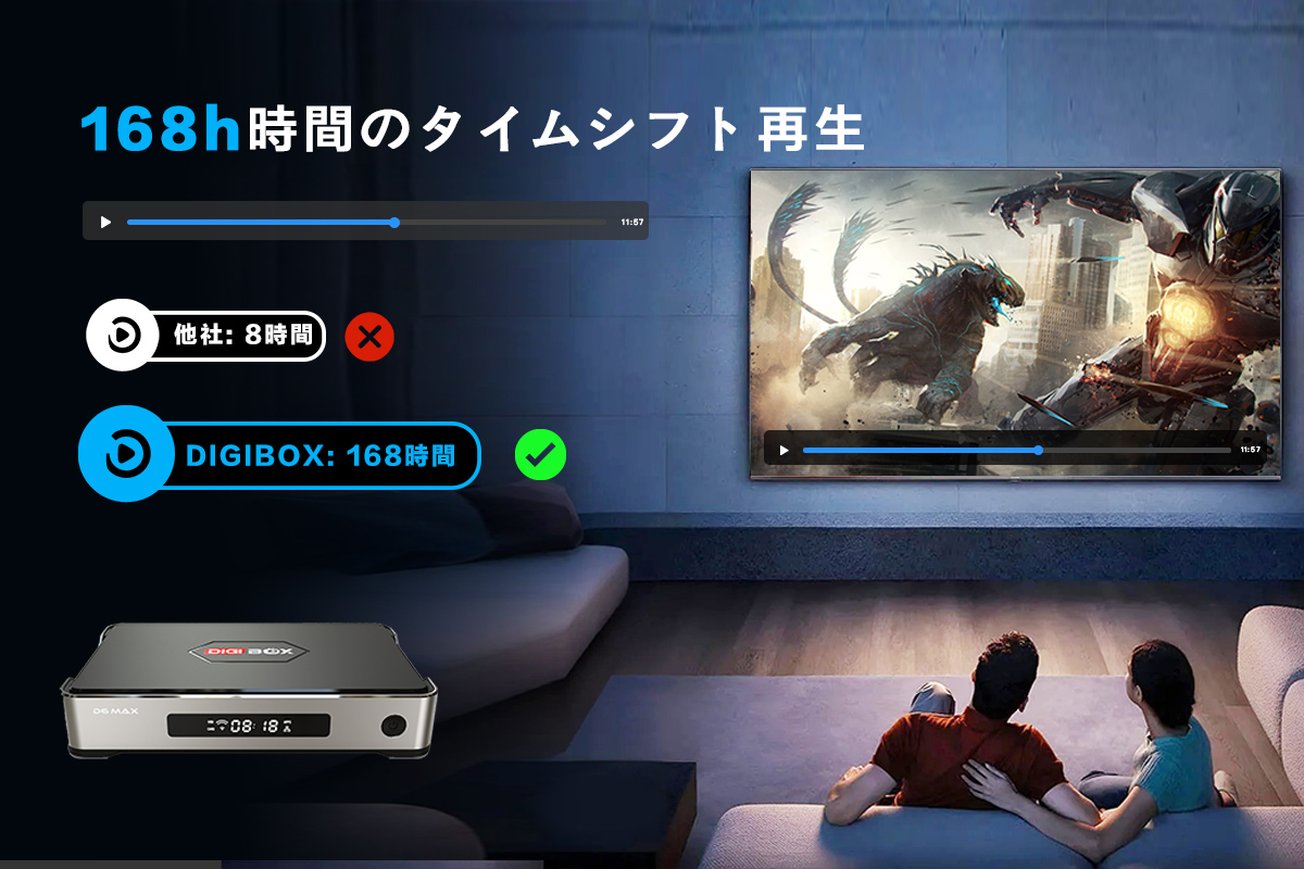 DIGIBox D6 Maxスマートメディアプレーヤー - 7日間の再生と168時間のタイムシフト機能で、どんな瞬間も逃しません。過去1週間のお気に入りの番組をリプレイして、いつでも好きなときにフレキシブルなオンデマンド視聴をお楽しみください。