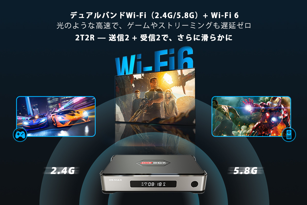 ギガビット イーサネットと Wi-Fi 6 を搭載した DIGIBox D6 Max メディア ストリーミング プレーヤーは、より高速で安定したインターネット接続を実現し、遅延のない 4K および 8K ストリーミングに最適です。