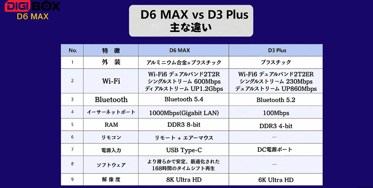 ▶️DIGIBOX D6 MAXはD3から大幅に進化し、強力なハードウェアと最先端の機能により、パフォーマンスが大幅に向上しました。クアッドコアプロセッサ、Mali G31 GPU、4GB RAMを搭載したD6 MAXは、D3とは異なり、高解像度および4Kコンテンツをスムーズで遅延のないストリーミングで視聴できます。また、8Kビデオの再生にも対応し、より充実した視聴体験を提供します。D6 MAXのUSB-C電源ポートは、D3が従来の電源技術を採用しているのに対し、耐久性と利便性に優れています。ホームエンターテイメントでもゲームでも、D6 MAXはD3を凌駕し、プレミアムスマートTVボックスの新たな基準を確立します。