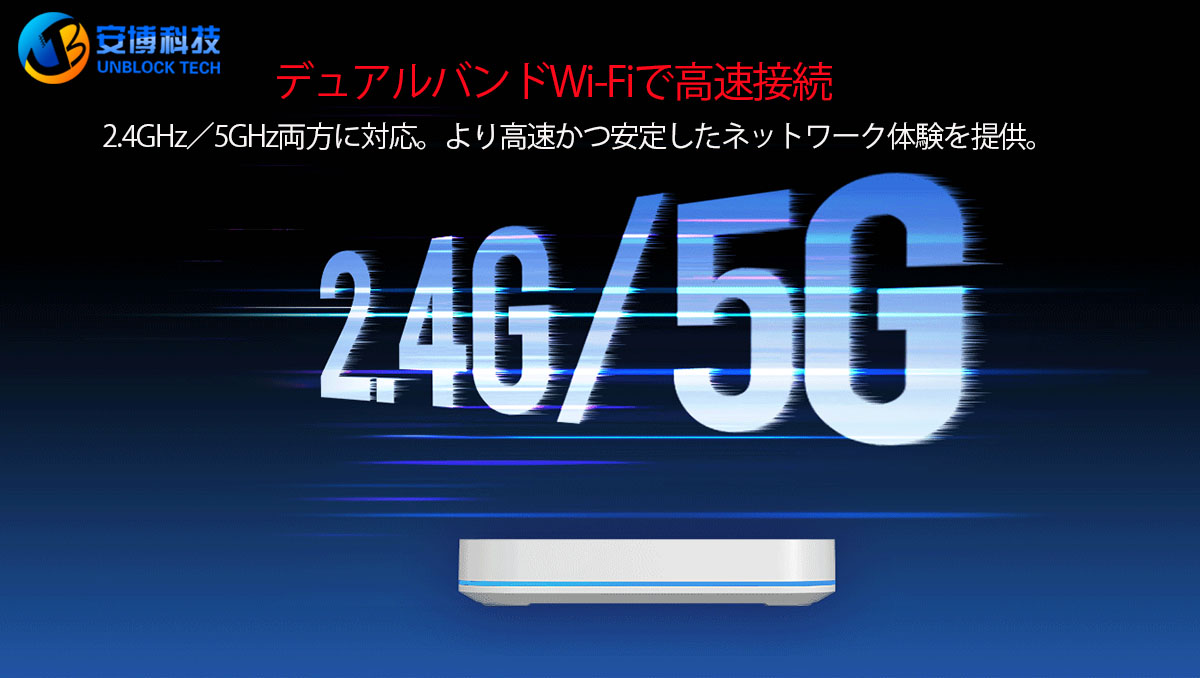 ▶️Unblock Tech UBox12 Android TVストリーミングボックスは、2.4GHzと5GHzの両方の帯域に対応したデュアルバンドWi-Fiを搭載し、高速で安定したインターネット接続を実現します。高速ブロードバンドでスムーズなストリーミング、ゲーム、ブラウジングをお楽しみいただけます。バッファリングや中断のない、最適なエンターテイメント体験を提供します。